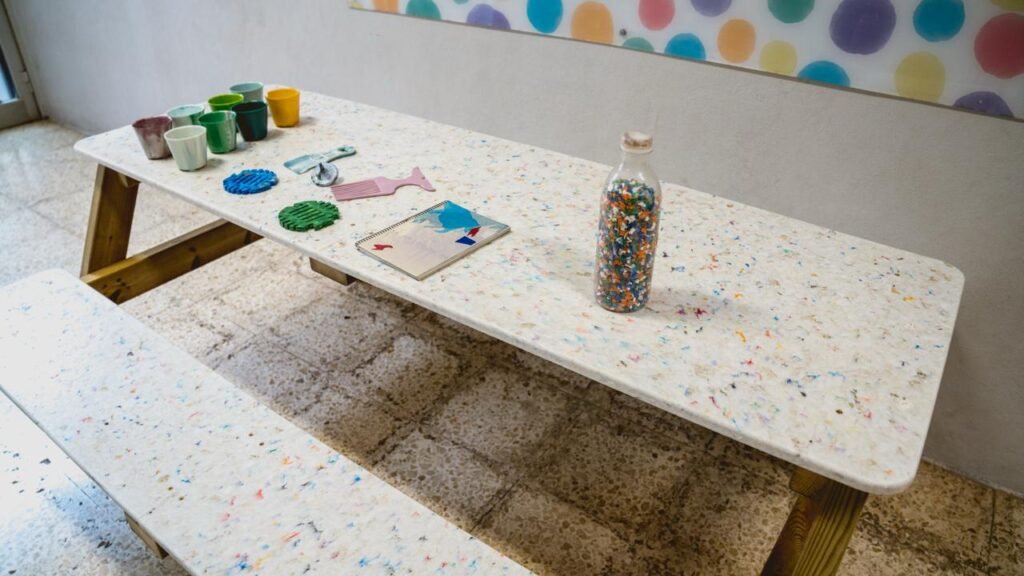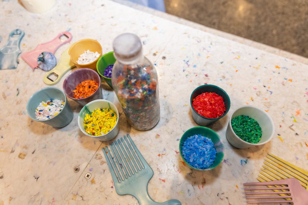 Con la materia prima lista (y la conciencia despierta), entró en juego la magia técnica de Precious Plastic Gran Canaria, transformando esos envases en mobiliario de diseño.